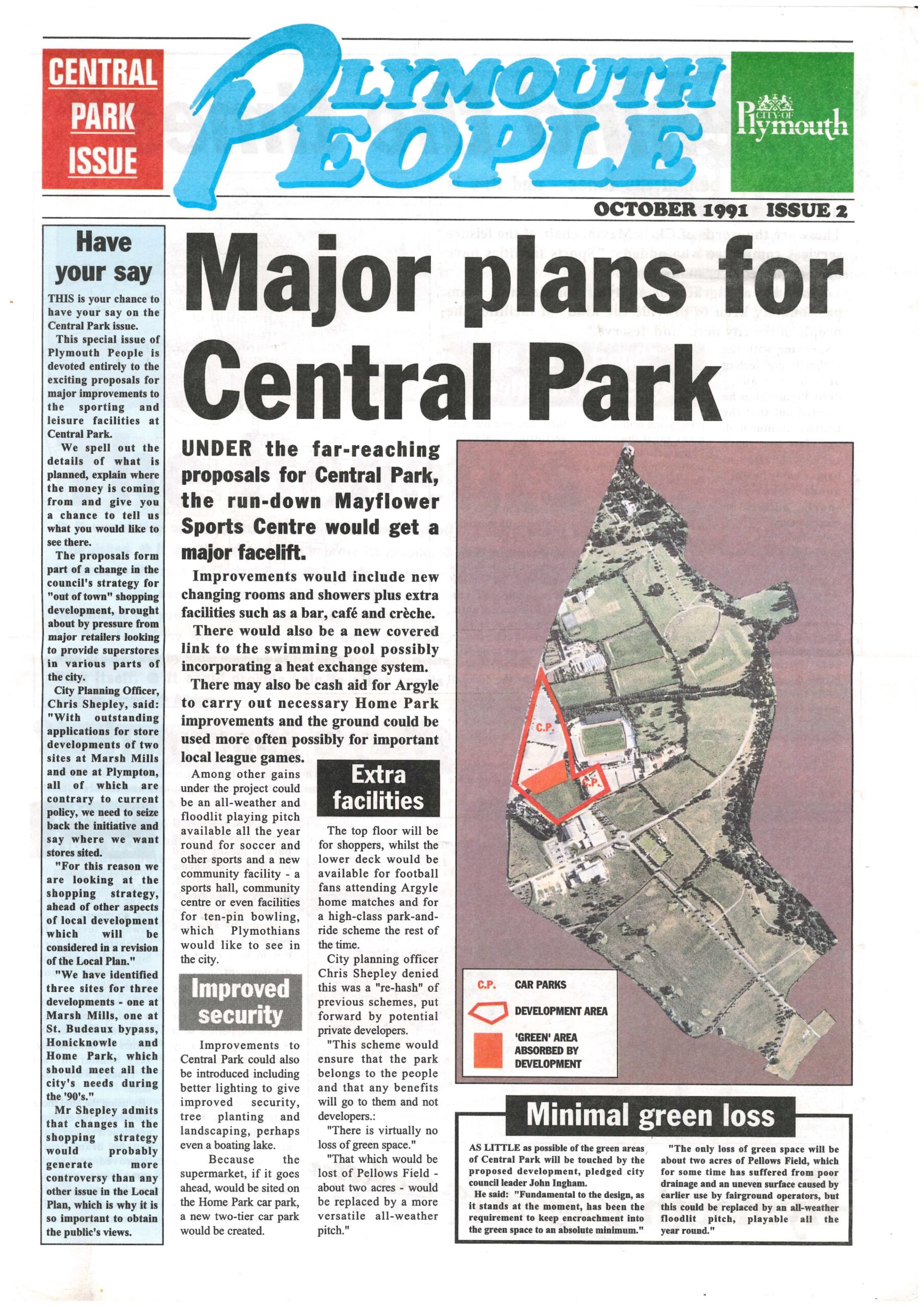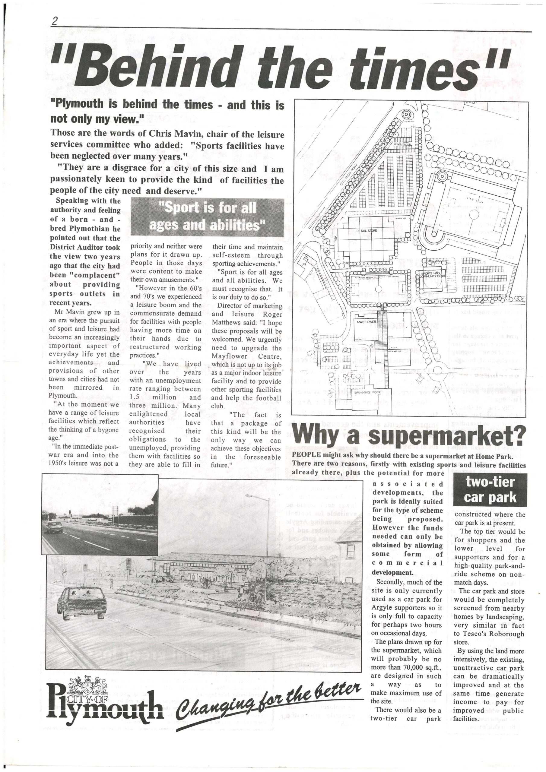 In a four-page edition of ‘Plymouth People’ in 1991, the Council set out its vision for better sports facilities which included refurbishing the run-down Mayflower Centre and the Home Park football stadium. It would have been part-funded by a supermarket on a section of the Outland Road carpark, with a second tier being added to the rest of the carpark. This vision lasted with minor changes until it was subsumed into the 2001 Central Park Action Plan.