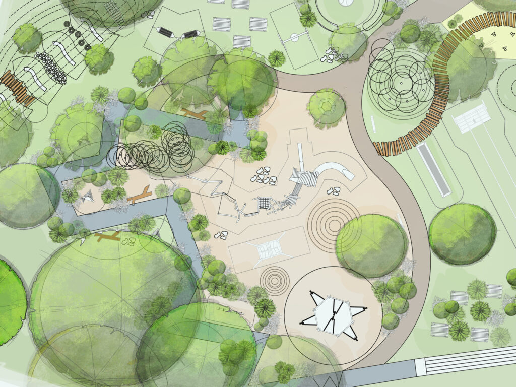 In 2017, the programme of park improvements included a new layout for the play area and new equipment on a theme of “birds, bees and butterflies.” Two areas were fenced for toddlers and young children and their features included multi-person swings, a tree house, a roundabout, water pumps and trays, and a large sandpit surrounded by decking. In the larger, open area for older children, there were trampolines, hammocks, low ropes, a double zip wire and a huge climbing and sliding structure. The suppliers, Russell Play, designed the equipment to be robust, in context with the wider park and having minimum impact on natural resources.