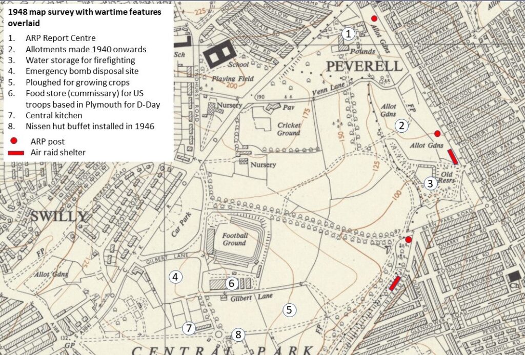 United States troops started to be billeted in Devon and Cornwall from 1943 and a food store was established next to the Home Park football stadium. A hutted camp was built on Alma Road next to Upper Knollys Terrace and used subsequently to house prisoners captured during the final stages of the war. They were employed on house building programmes after the war, including prefabs in Central Park, until the final repatriation in 1948.