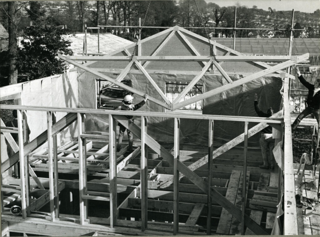 Planning documents from 1964 refer to the site as ‘Central Park Nursery’. A second boiler house was constructed in 1966 or 1967, and two more greenhouses shortly afterwards to make nine in total. By 1970, the greenhouses and outbuildings begin to be shown on maps. In the same year, another building was added as part of the Mayflower 350th anniversary celebrations. It was an experimental timber-framed house designed by the Timber Research and Development Association and built by John Laing Construction Ltd to assess the benefits of timber construction for local authority homes. The building, which provided a pair of semi-detached, three-bedroomed dwellings, was erected by crane on prepared foundations in one week with full completion in a further six weeks.