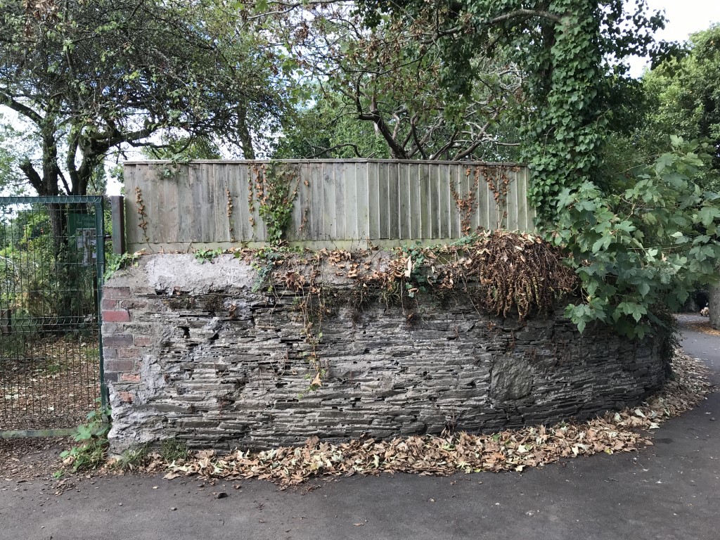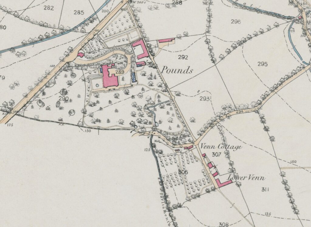 Sixty yards along Venn Lane from the Peverell Park Road end is a rough track that leads off between tree-bordered allotments. It originally led to Lower Venn, the farmhouse, until the land was purchased for Central Park in 1929. The track’s entrance on Venn Lane is marked by a curved stone wall behind which used to stand Venn Cottage.